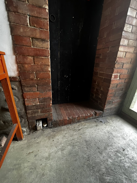 從屋外走進內廳:當年建築底部有孔洞(左下方),作為排水之用,這道牆成為內外廳的分野。